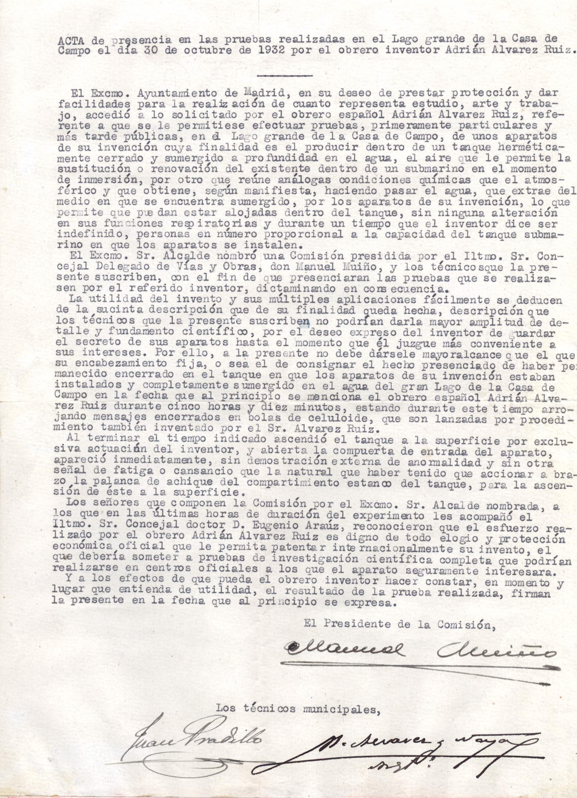 Las pruebas propiamente dichas se describen en un "acta de presencia" de las mismas que firmaron el Concejal Delegado de Vías y Obras y dos técnicos municipales. En este acta, se detalla que las tres personas mencionadas formaban una comisión nombrada por el Alcalde de Madrid para que emitieran un dictamen sobre el invento. El documento explica que el inventor permaneció más de cinco horas sumergido en el lago en un tanque hermético sin más aire que el creado por su aparato. Durante todo el tiempo que duró la prueba, Adrián lanzó a la superficie mensajes guardados en bolsitas de celuloide, también inventadas por él, a modo de prueba de vida en los que enviaba saludos a las autoridades. El acta también explica que al salir, una vez finalizada la prueba, Adrián estaba bien de salud y no mostraba señales de fatiga. A la vista de los resultados, la comisión reconoció que el invento era digno de elogio y merecedor de protección económica oficial y recomendó que se realizaran pruebas de investigación más completas en centros oficiales. Por deseo expreso del inventor, el acta no detalla las características técnicas del invento, ya que Adrián quería guardar el secreto técnico del mismo hasta el momento que él considerase más conveniente.